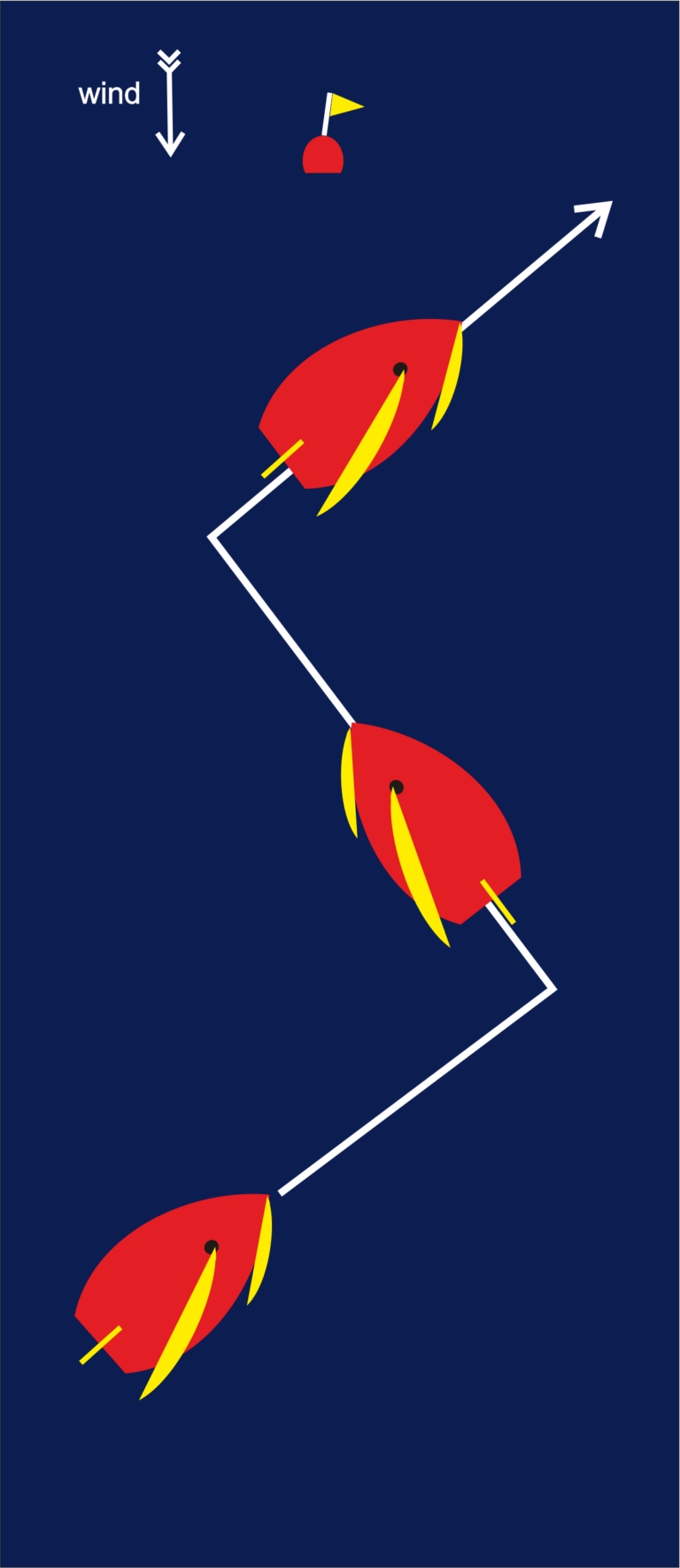 “In de wind” is een exacte koers. Het is recht tegen de wind in. Zodra je niet meer recht in de wind ligt, dan noemen we het niet meer “in de wind”.